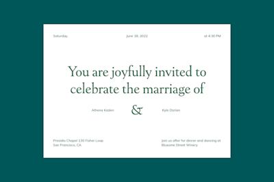 Still not sure where to start? Match your invite to your wedding theme. Set the tone for your big day with a romantic calligraphy font or whimsical watercolor design. You can also create your own design and upload it to Zola to take advantage of our free guest addressing and free envelopes. Whether you’re choosing a custom wedding invitation or popular design, remember: this is your special day, and Zola is here to help you get the wedding invites you want.