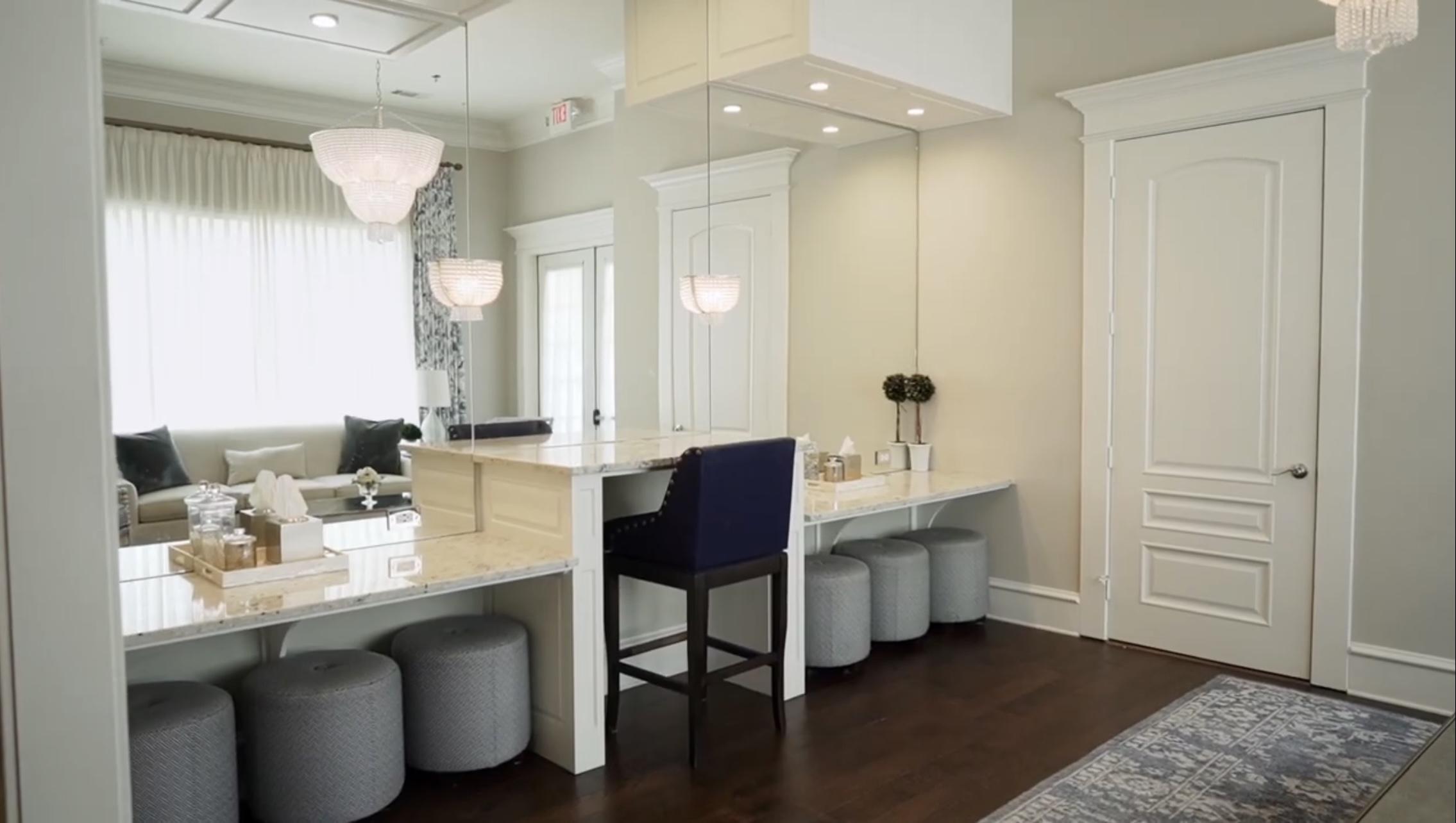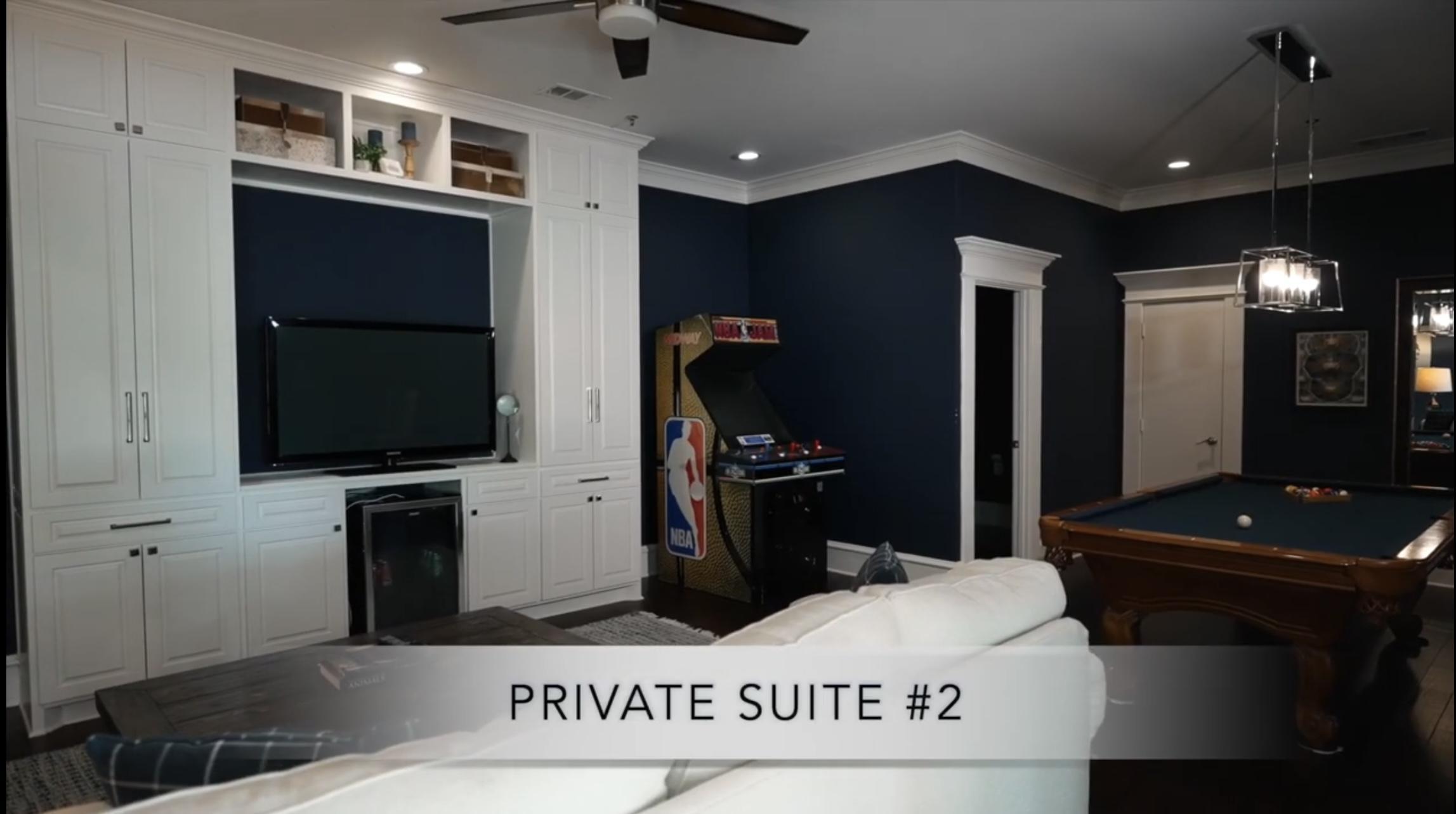 Our primary suite includes natural light, vanity seating, a large floor-length mirror, and private restroom. Our secondary suite includes hardwood floors, a kitchenette/mini bar, lounge seating, a flat-screen, a billiard table, gaming system, and a private restroom