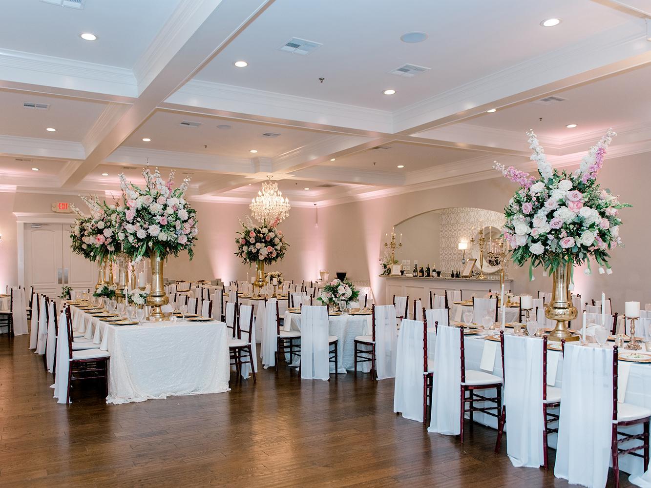 Indoors, there’s a fireplace lounge and winding staircase for cozy ceremonies, as well as a ballroom replete with rich woods, a crystal chandelier, and even French doors leading to a terrace. For your reception, you and your loved ones can dine and dance the night away under crystal chandeliers. Their ballroom features clean, neutral colors and can easily be decorated as you see fit.